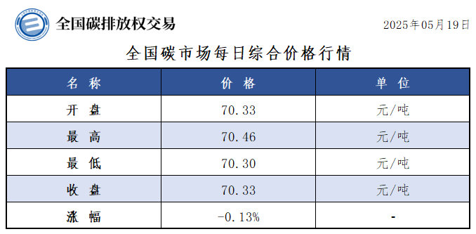 【CEA】全国碳市场每日综合价格行情及成交信息20250519