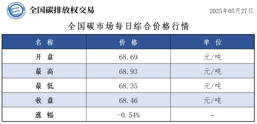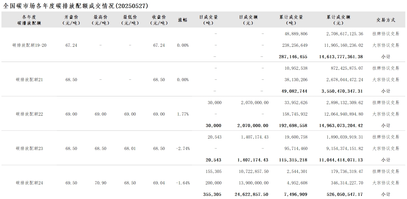 【CEA】全国碳市场每日综合价格行情及成交信息20250527