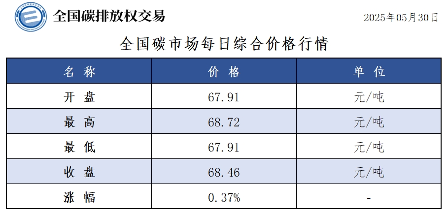 【CEA】全国碳市场每日综合价格行情及成交信息20250530