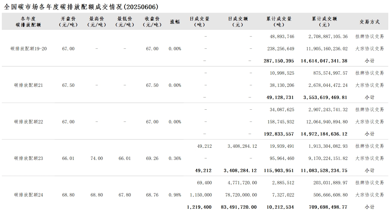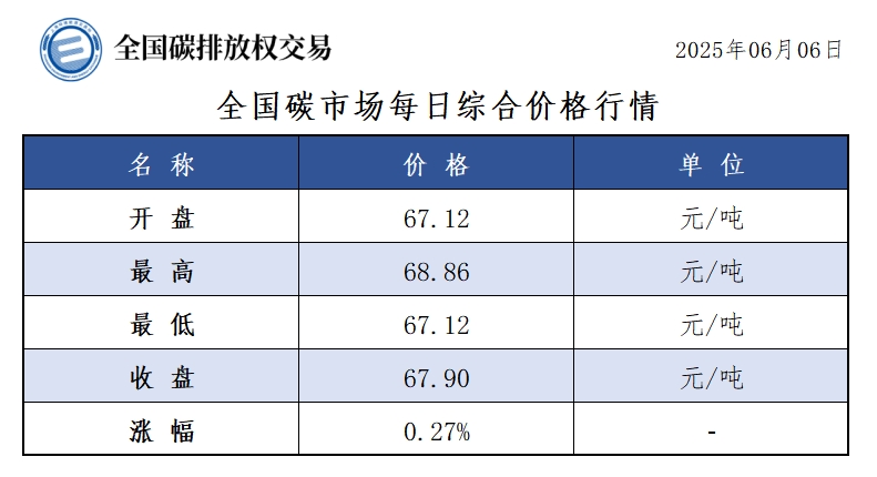 【CEA】全国碳市场每日综合价格行情及成交信息20250606