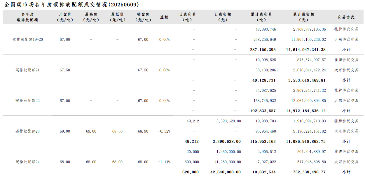 【CEA】全国碳市场每日综合价格行情及成交信息20250609