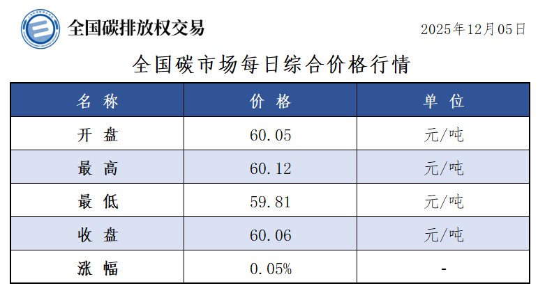 【CEA】全国碳市场每日综合价格行情及成交信息20251205
