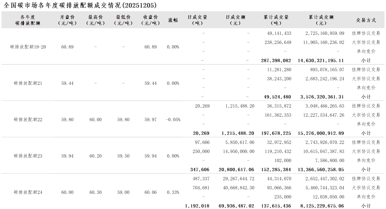 2025年1月1日至12月5日,全国碳市场碳排放配额成交量194,232,943吨,成交额11,941,705,298.91元。
