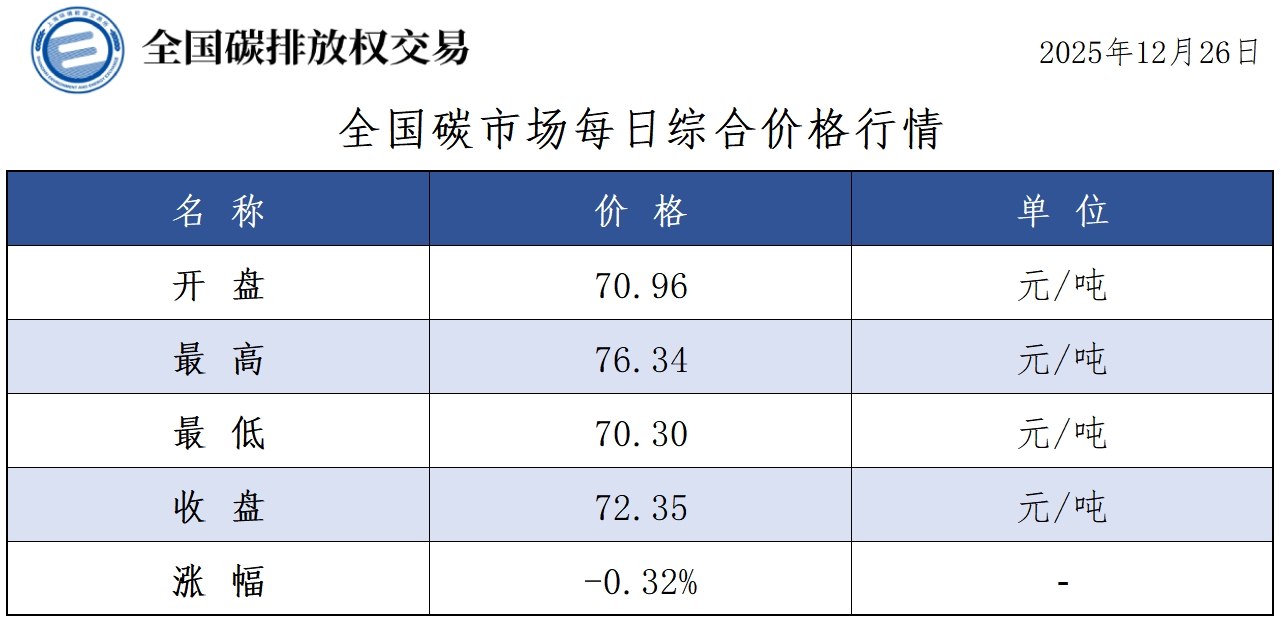 【CEA】全国碳市场每日综合价格行情及成交信息20251226