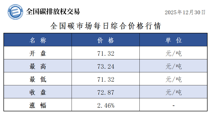 【CEA】全国碳市场每日综合价格行情及成交信息20251230