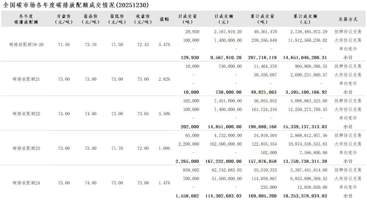 2025年1月1日至12月30日,全国碳市场碳排放配额成交量233,632,744吨,成交额14,556,672,930.17元。