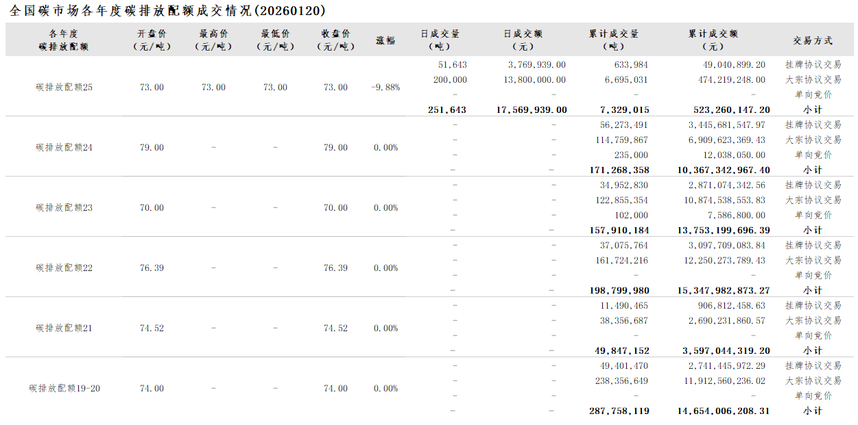 【CEA】全国碳市场每日综合价格行情及成交信息20260120