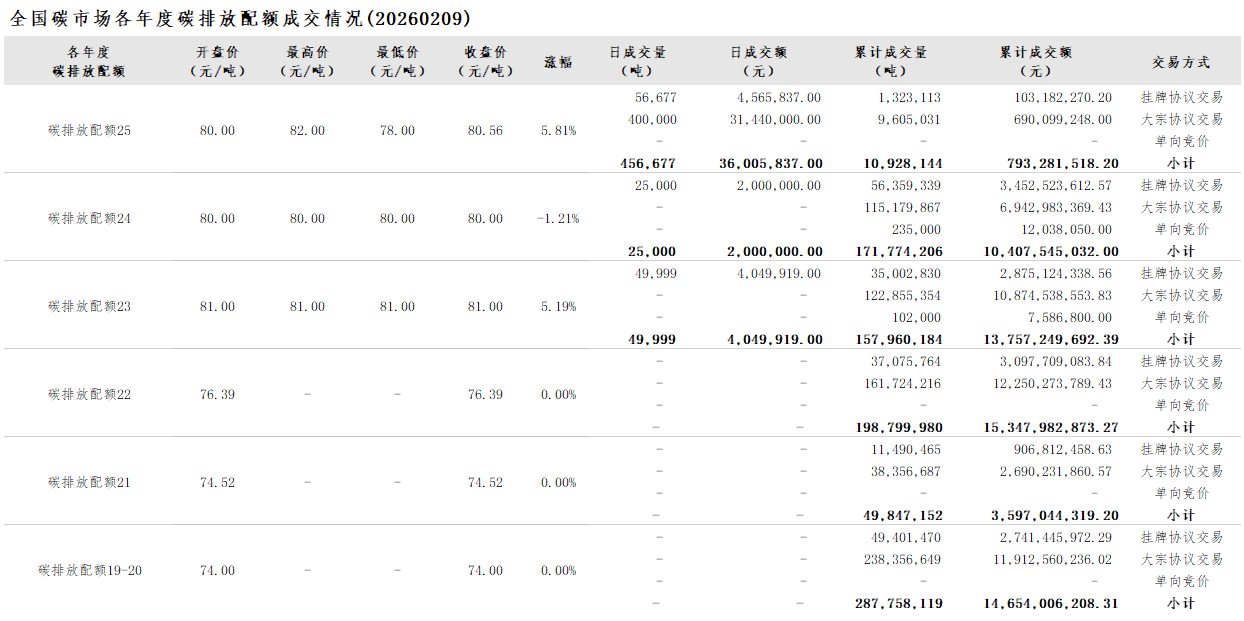 2026年1月1日至2月9日,全国碳市场碳排放配额成交量12,201,265吨,成交额894,491,411.80元。