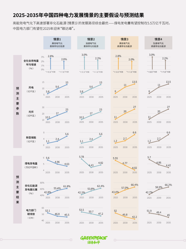 2025-2035年中国四种电力发展情景的主要假设与预测结果 © Greenpeace