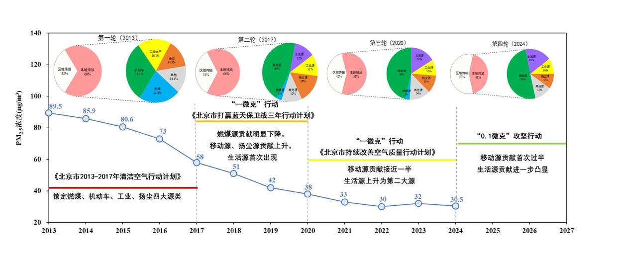 图2:2013~2024年北京市PM2.5来源解析结果及不同阶段政策措施情况这已经是北京市发布的第四轮PM2.5来源解析结果。前三轮分别在2014年、2018年和2021年发布。每一轮PM2.5源解析结果,都为不同阶段大气污染治理明确了重点方向,有力支撑了北京市空气质量持续改善。
