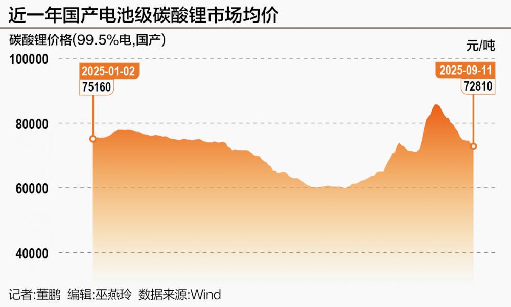 Wind数据显示,9月11日,国内电池级碳酸锂市场均价为7.28万元/吨。富宝资讯等市场机构追踪的现货价格,则降至7.1万元/吨附近。