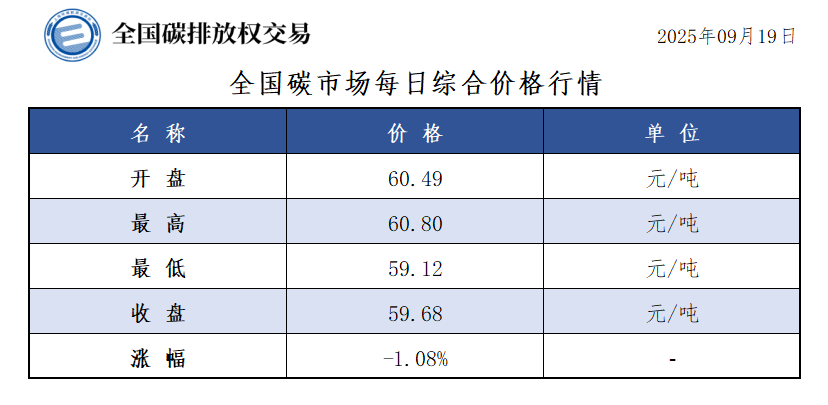【CEA】全国碳市场每日综合价格行情及成交信息20250919