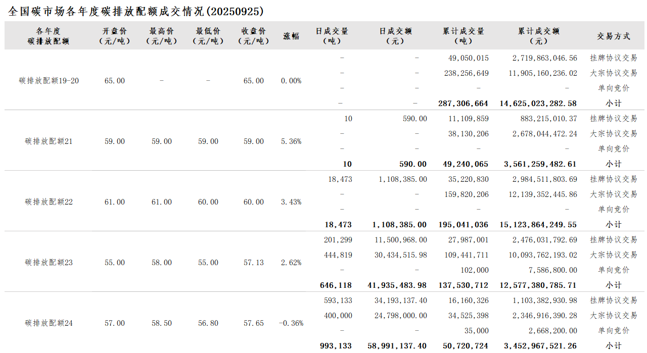 【CEA】全国碳市场每日综合价格行情及成交信息20250925