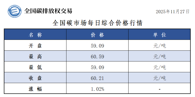 【CEA】全国碳市场每日综合价格行情及成交信息20251127