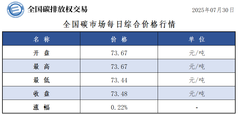 【CEA】全国碳市场每日综合价格行情及成交信息20250730