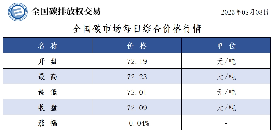 【CEA】全国碳市场每日综合价格行情及成交信息20250808