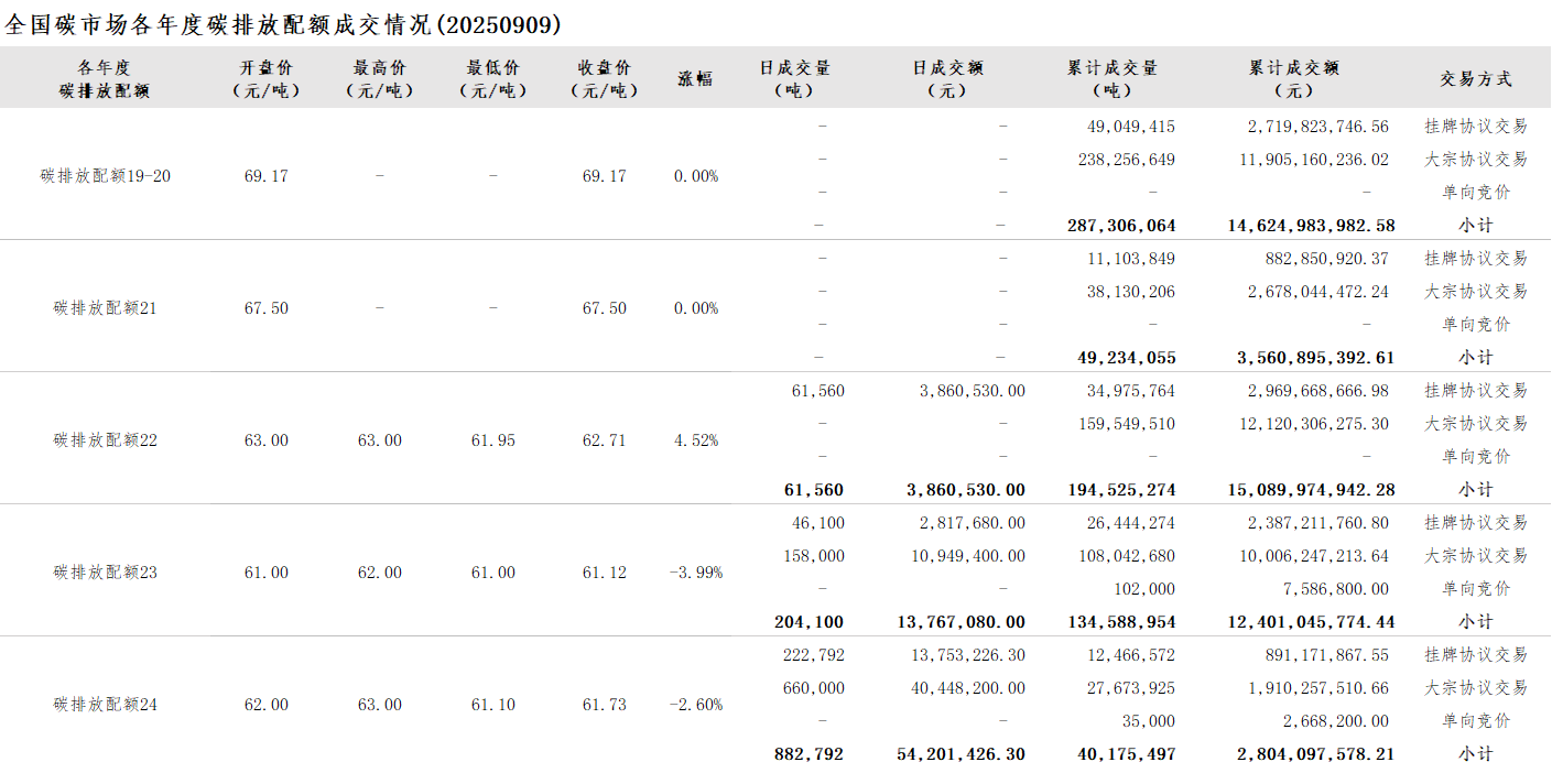 【CEA】全国碳市场每日综合价格行情及成交信息20250909