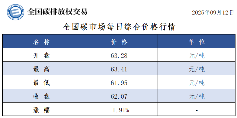 【CEA】全国碳市场每日综合价格行情及成交信息20250912