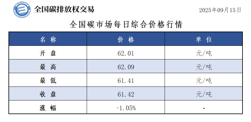 【CEA】全国碳市场每日综合价格行情及成交信息20250915