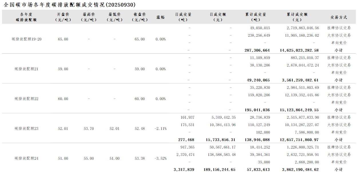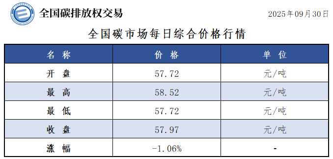 【CEA】全国碳市场每日综合价格行情及成交信息20250930