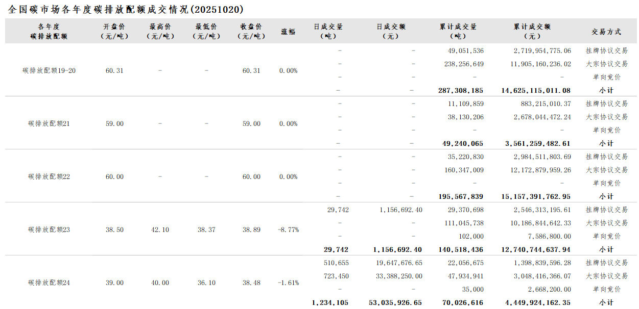 2025年1月1日至10月20日,全国碳市场碳排放配额成交量112,392,477吨,成交额7,501,707,953.42元。