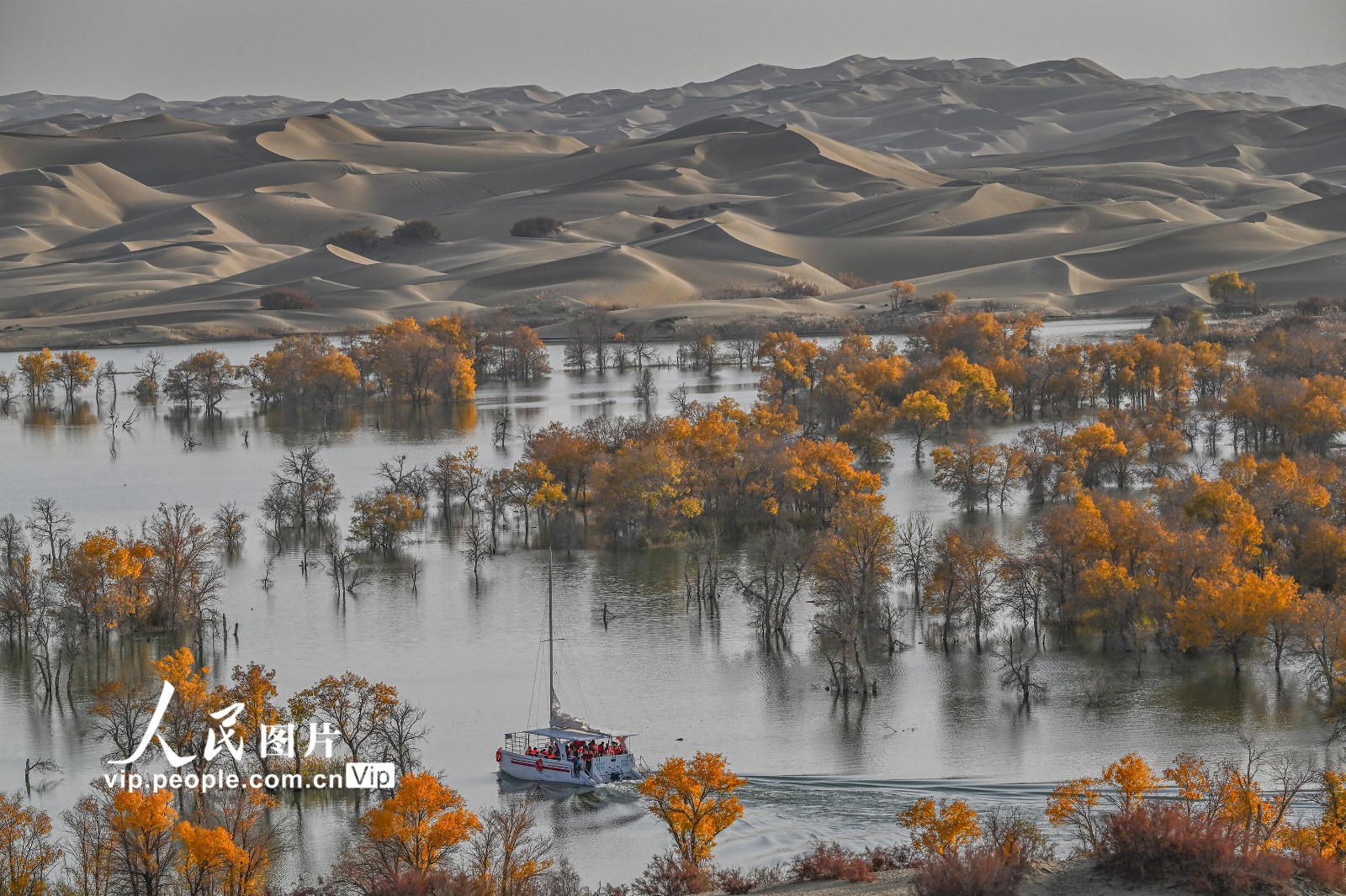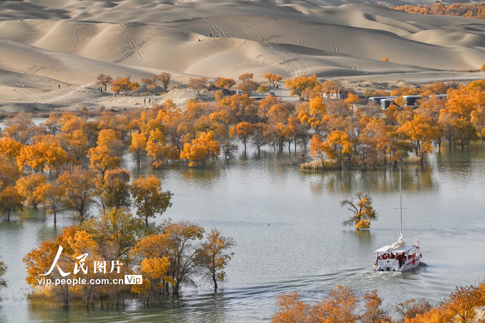 2025年10月26日,新疆维吾尔自治区尉犁县葫芦岛景区,游客乘船游览,欣赏大漠胡杨美景。韩峻摄(人民图片网)