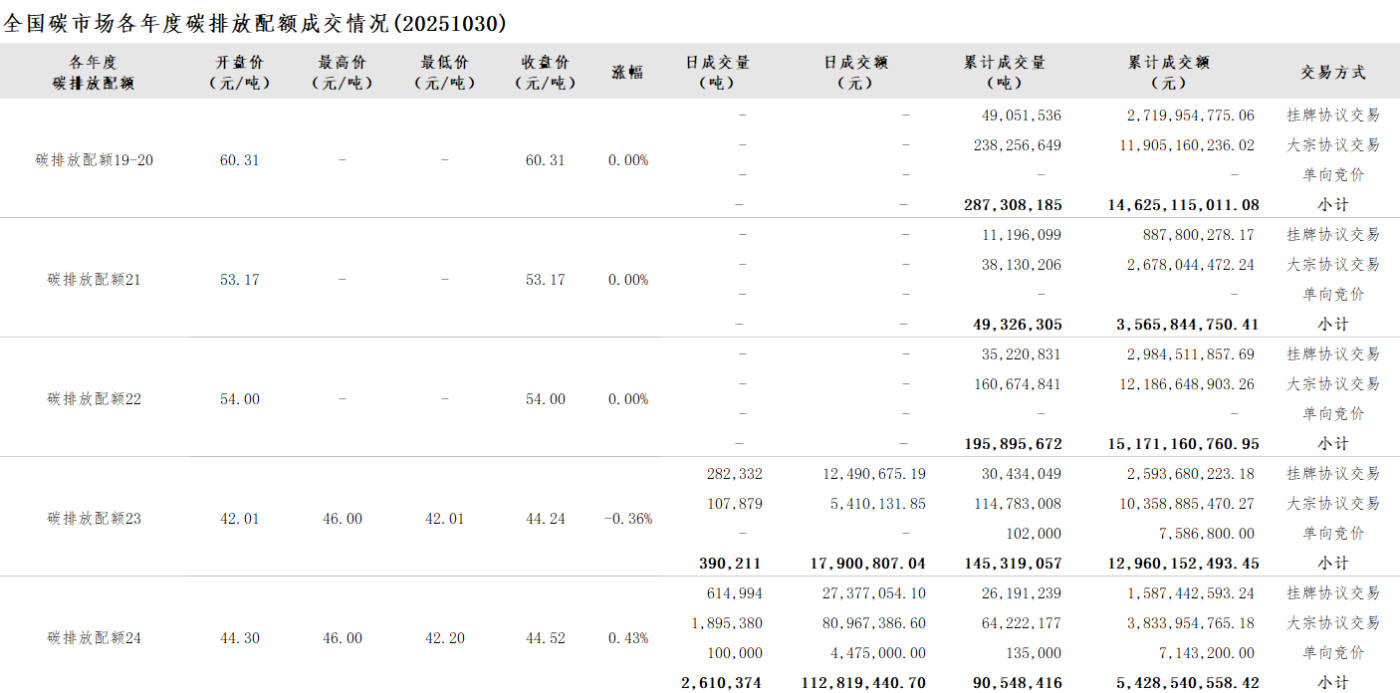 【CEA】全国碳市场每日综合价格行情及成交信息20251030