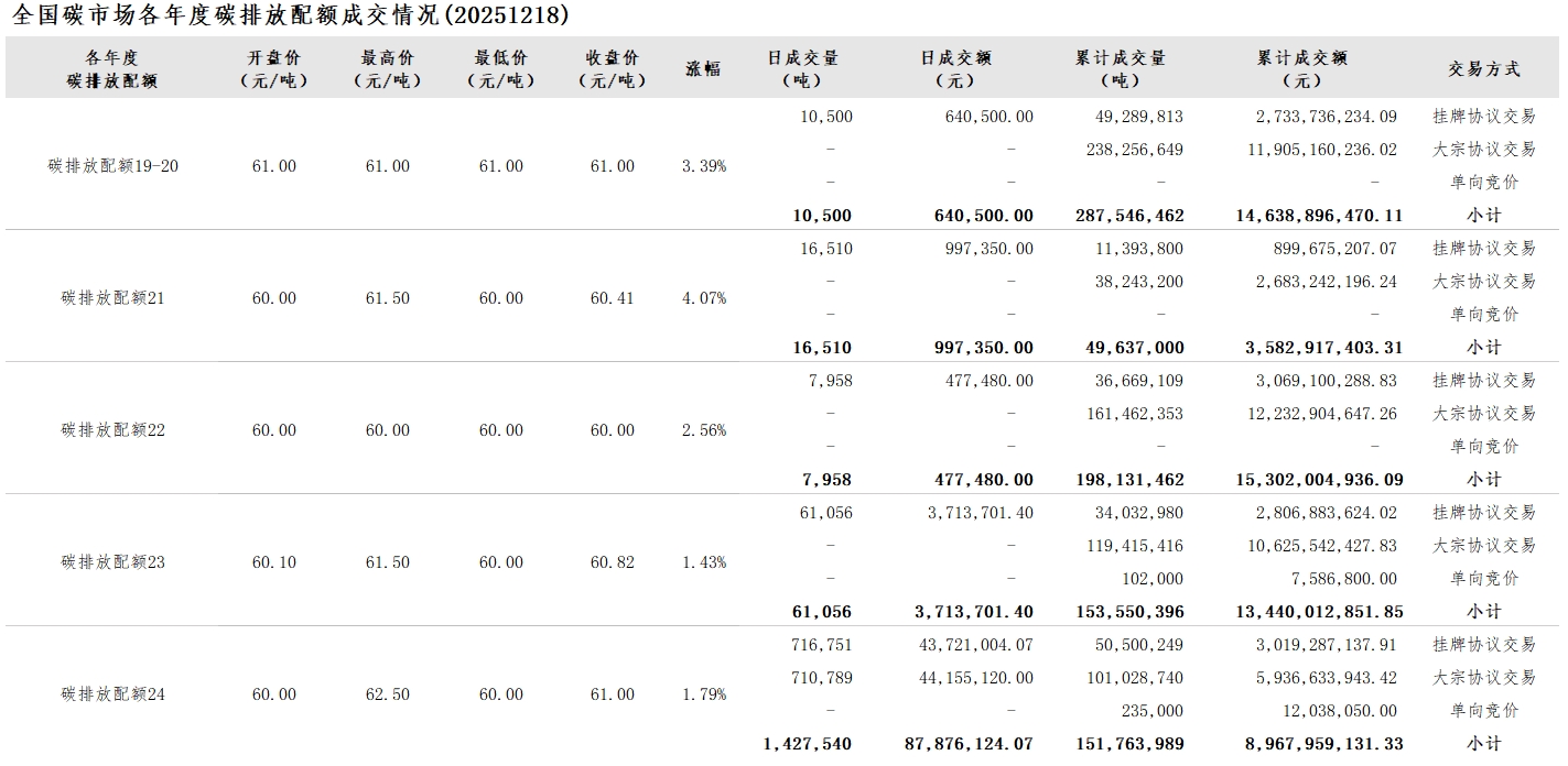 【CEA】全国碳市场每日综合价格行情及成交信息20251218